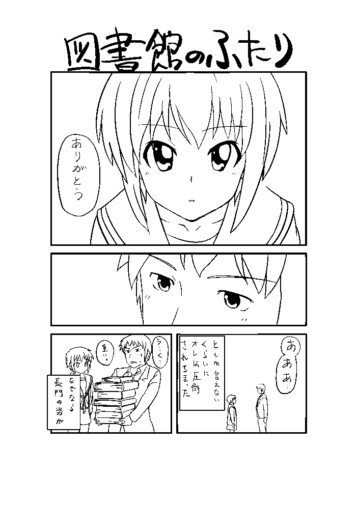 ボツネームの中の1ページです。とにかくボツです。ただの自己満足妄想純愛ラブラブストーリーでした。 図書館に2人で行き、長門の借りた本をもってやるというキョンに長門が一言かけたとこです。 同人誌って難しい。 |